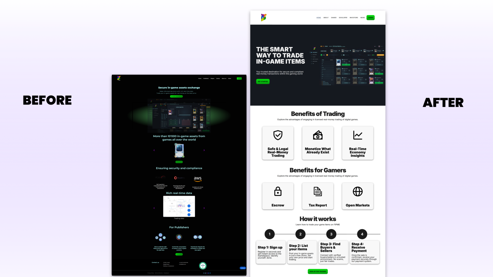 Design and development of the FiPME.io website, a digital platform focused on in-game asset exchange and monetization for gamers and publishers.